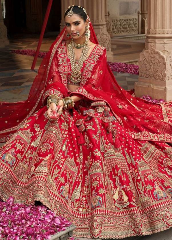 Rich red or maroon lehenga with emerald-stone jewelry is a look that is both regal and striking, with the deep colored stones providing contrast against traditional bridal colors.